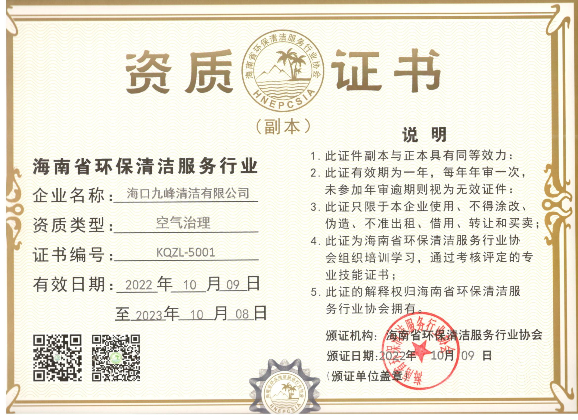空气治理资质证书