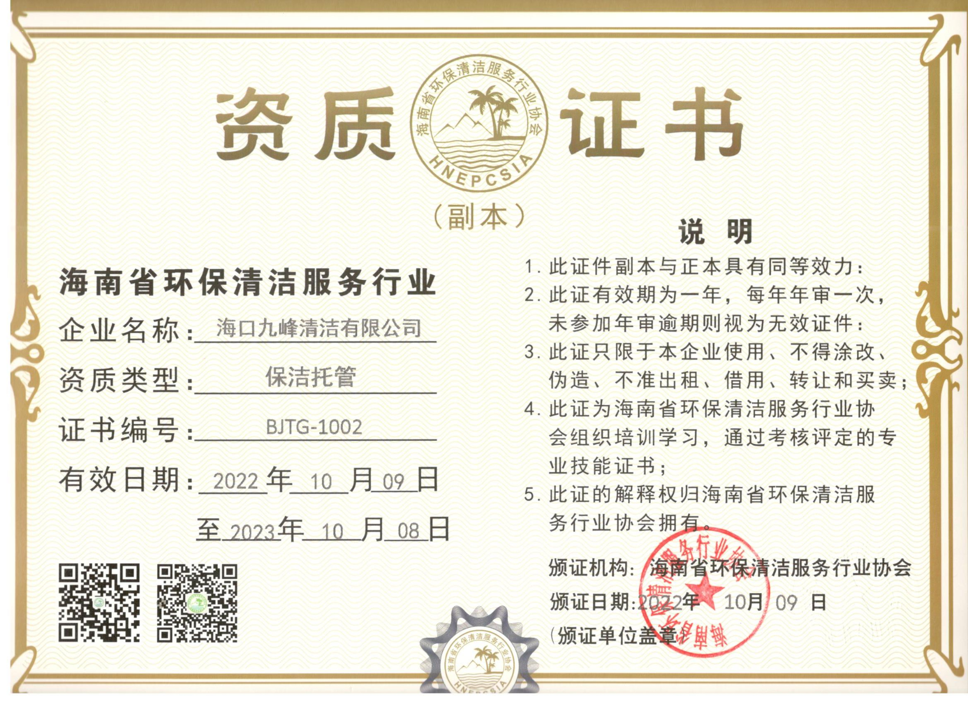保洁托管资质证书